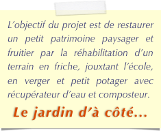 Notre partenariat avec le Parc naturel régional Scarpe-Escaut s’est mis en place dans un climat de confiance et d’échanges conviviaux avec un souci d’efficacité. Les différents contacts ont permis de guider notre réflexion et de bénéficier de précieux conseils techniques pour la transformation de notre friche en petit verger et jardin potager ; plan d’aménagement, choix des essences...